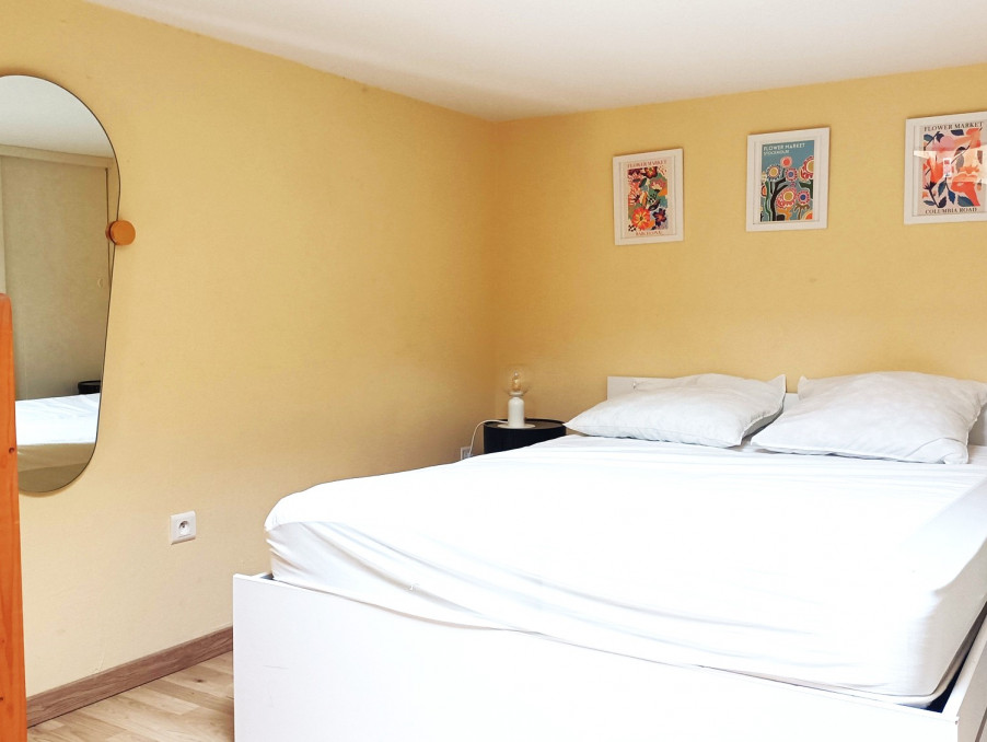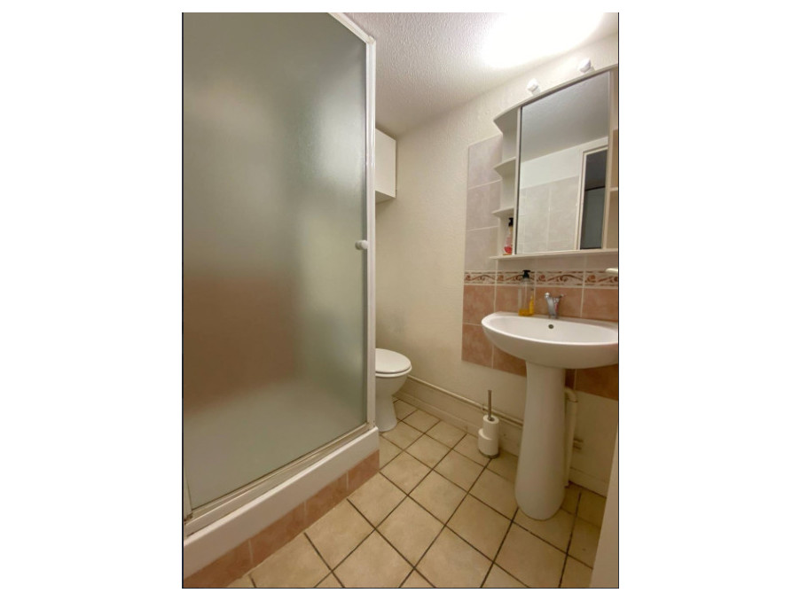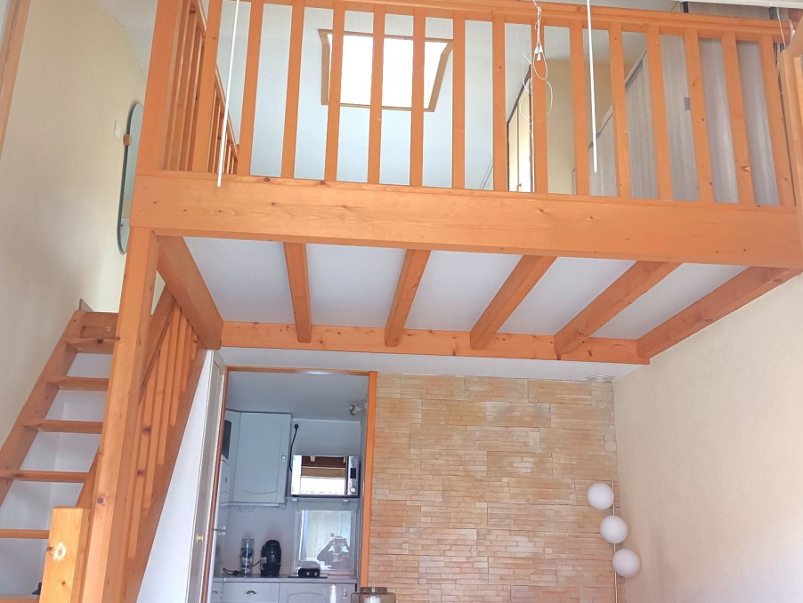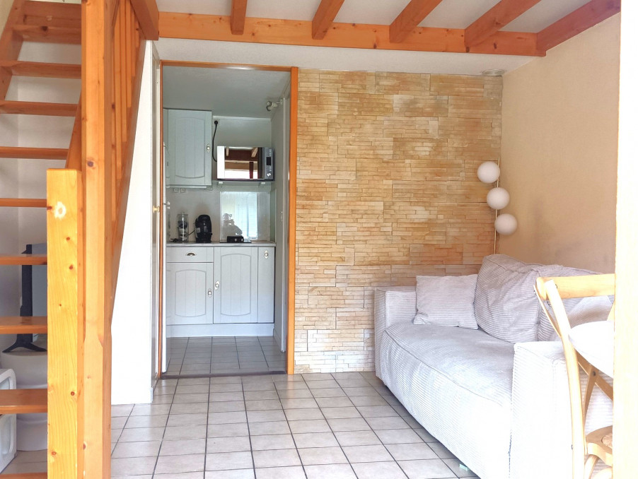 séjour ouvrant sur une terrasse ( 9,24 m2 ), coin cuisine équipée, salle d'eau. A l'étage R+1 / mezzanine : chambre mansardée / placard, avec clim réversible. Parking collectif.