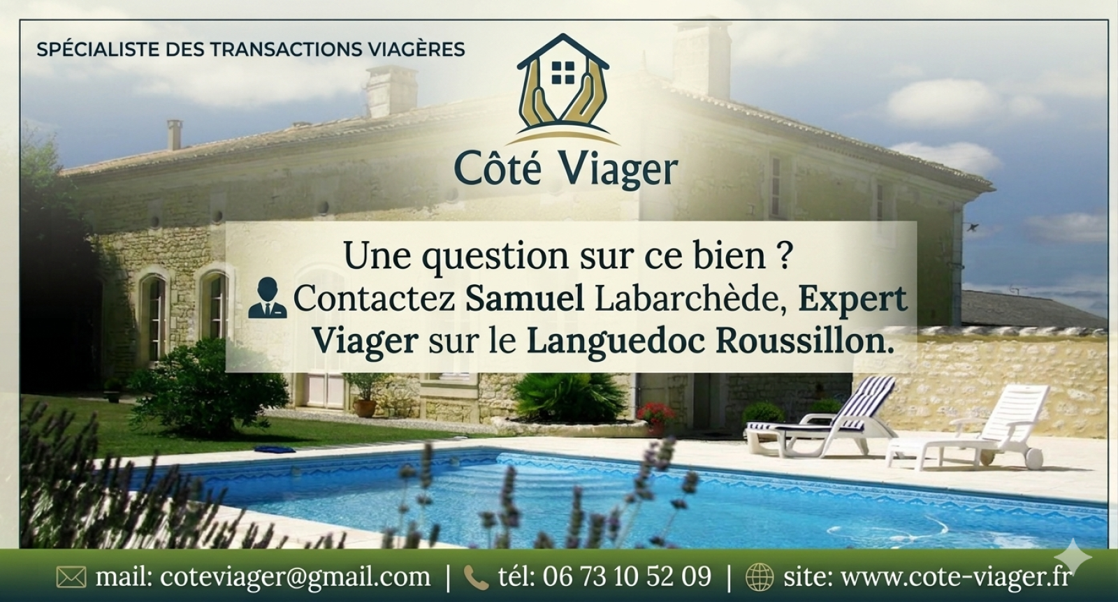 Contactez Samuel Labarchede réseau Expertimo / Cabinet Côté Viager SARLU au capital de 1000 € dont le siège social est situé au 7 rue de la source 34410 Sauvian N° 804 437 424 R.C.S Code NAF 6831 Z - carte professionnelle délivrée par le CCI de Montpellier N°CPI : 34012018000028680 ( transaction sur immeuble et fonds de commerce) . Caisse de garantie Galian rue de la boétie 75008 Paris pour un montant de 120000 euros-