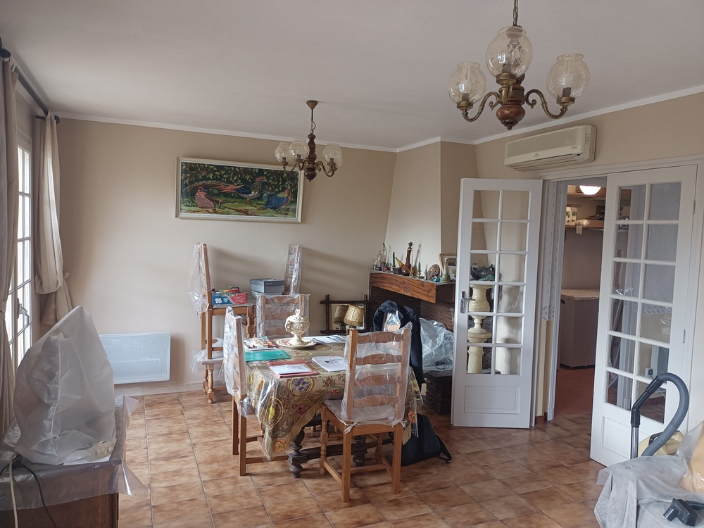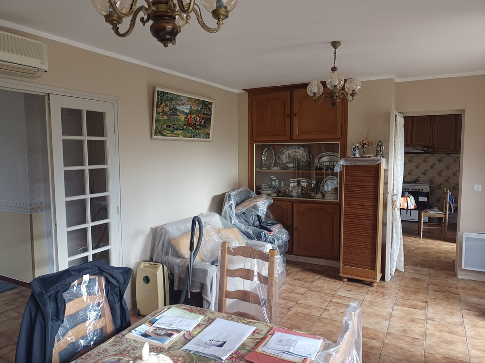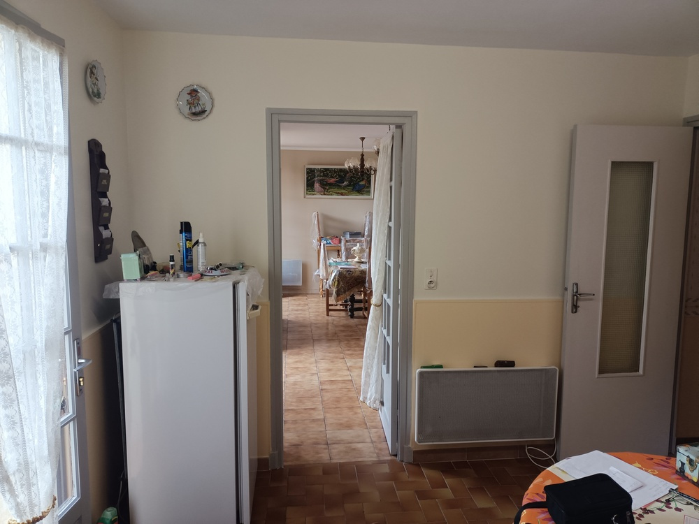 Bram ( 11150 ) Située à proximité des commerces, maison mitoyenne T4/5 ( 2 faces ) d'environ 81,50 m2 habitables + 14 m2 de véranda composée : entrée, séjour / cheminée, cuisine séparée ouvrant sur une véranda ( accès direct jardin ), 1 chambre / placard, salle d'eau, wc séparés, cellier. A l'étage R+1, 2 chambres mansardées / placards. Chauffage électrique, clim non réversible, simple vitrage. Le tout sur un terrain clôturé d'environ 395 m2 avec remise, puit, garage non attenant. travaux de rafraîchissement à prévoir. Particularité : 2 entrées indépendantes sur la parcelle. Taxe foncière 2022 600 euros ( propriétaire actuel exonéré depuis cette date ) Investissement sûr pour sa retraite !