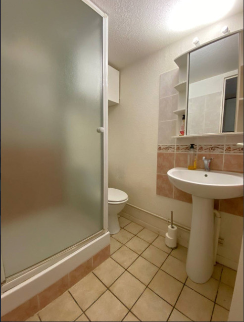 séjour ouvrant sur une terrasse ( 9,24 m2 ), coin cuisine équipée, salle d'eau. A l'étage R+1 / mezzanine : chambre mansardée / placard, avec clim réversible. Parking collectif.